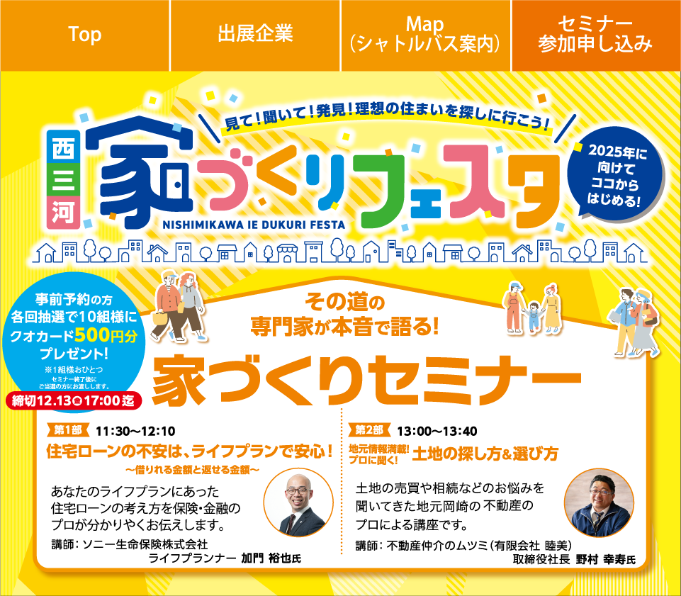 ※ご記入いただきました個人情報は適正に管理し、2024年12月14日(土)開催の「西三河家づくりフェスタ」の参加予約の運営のために使用させて頂きます。※IPアドレスを記録しております。いたずらや嫌がらせ等はご遠慮ください
